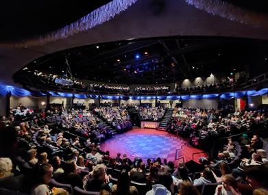 The current building, opened in 1986, is famous as the first purpose-built theatre, in the round, in Europe. In an intimate 600 seater auditorium, the audience entirely surround the stage, the action is so close you could almost reach out and touch the actors.